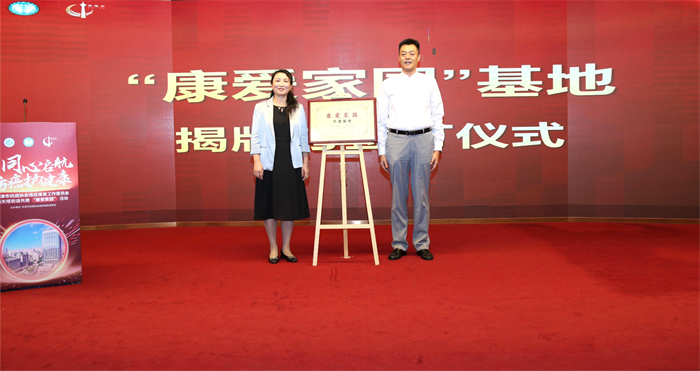 在与会嘉宾与社区居民的共同见证下,天津市河西区天塔街道党工委书记房磊,天津医科大学肿瘤医院副院长、天津市抗癌协会癌症康复工作委员会主任委员黑静为“康爱家园”基地揭牌。