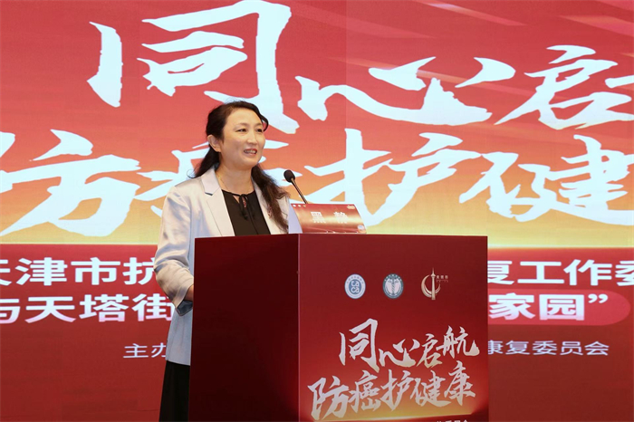 天津医科大学肿瘤医院副院长、天津市抗癌协会癌症康复工作委员会主任委员黑静致辞,对各位领导、专家和居民朋友表示衷心感谢。她强调,天津医科大学肿瘤医院、天津市抗癌协会癌症康复会在河西区天塔街共建“康爱家园”基地,是推进优质医疗资源进社区,加强医防融合、科普宣教和志愿康复服务的重要举措,倡导肿瘤防治“早预防、早筛查、早诊断、早治疗”是落实“健康中国”战略的重要举措。通过共建,以党建为引领,围绕“组织共建、活动共联、互助互利、共同发展”,秉承“肿瘤康复、赢在整合”的核心理念,为癌症康复者和社区居民提供专业技术和服务支持。她希望河西区癌症康复会做出特色、做出品牌,发挥癌症康复示范引领作用,助力抗癌事业的发展。