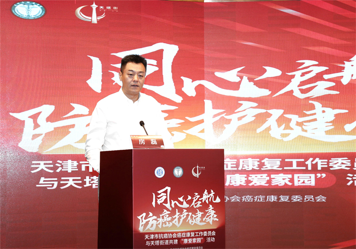 天津市河西区天塔街道党工委书记房磊讲话,对出席本次活动的各位专家和居民朋友的到来表示热烈欢迎。他表示,“康爱家园”共建是天塔街道党工委与肿瘤医院深化党建引领的具体实践,将医院的医疗专业优势与街道的协同治理优势紧密结合,把党建活力转化为服务群众的实际成效。天塔街道将以党建为引领,以“康爱家园”为平台,持续深化与专业医疗机构协作,整合社区资源,为居民提供更贴心、更便捷的健康管理服务,真正实现健康服务“零距离”。