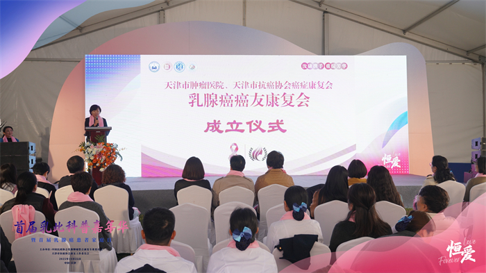 天津市肿瘤医院副院长、天津市抗癌协会癌症康复工作委员会主任委员黑静讲话。乳腺癌是严重威胁女性健康的疾病,患者面临的不仅是身体的康复,更有心理重建、社会功能恢复等深层需求,需将“治疗疾病”同步联合“治愈心灵”。本次成立的乳腺癌癌友康复会,将通过康复科普、同伴咨询、心理及运动康复等,成为传递科学康复知识、分享抗癌经验、重塑生活信心的“心灵港湾”。希望未来康复会能照亮患者从“幸存者”到“生活强者”的蜕变之路,为乳腺癌患者增强战胜疾病的信心,重塑美丽与健康。
