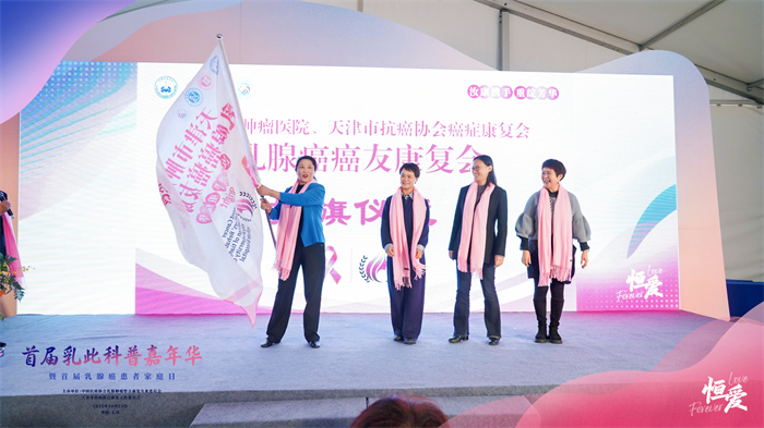 天津市肿瘤医院副院长、天津市抗癌协会癌症康复工作委员会主任委员黑静为“乳腺癌癌友康复会”会长王晴,副会长武佩佩、杨蓓蓓、唐秀娟授旗,旗帜以粉色为主色调,象征女性力量与希望,更是责任与使命的传递。康复会将以科学为盾、以温暖为援,为每一位乳腺癌患者筑起希望的堡垒。