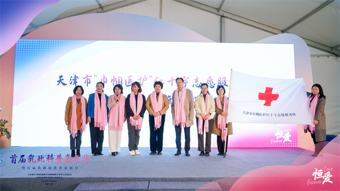 天津市红十字会党组书记,常务副会长韩晓芬为由乳腺肿瘤二科主任刘红牵头,全市各医院相关多学科专家组成的医护团队授旗,授予天津市“巾帼医护”红十字志愿服务队称号。