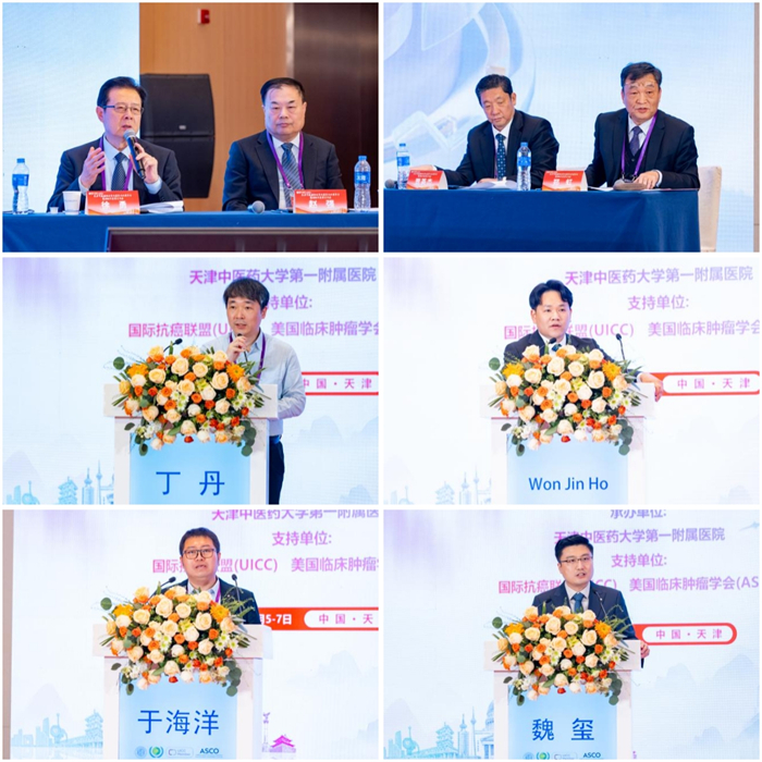 主旨报告环节,国内外专家轮番带来前沿观点与实践成果,覆盖基础研究、临床应用、技术创新等多个维度:中山大学肿瘤防治中心马骏院士以“以临床问题为导向开展科技创新”为题,结合自身研究实践,强调肿瘤科研需紧扣临床需求,通过典型案例阐述“从临床到科研再到临床”的完整实践路径,引发对“临床与科研协同发展”的深度思考;ASCO副主席Christopher R. Merlan教授聚焦 “AI in Oncology-from Promise to Practice”,系统解读人工智能在肿瘤早筛、精准诊断、治疗方案优化等环节的应用现状与瓶颈,分享ASCO推动AI与肿瘤临床融合的实践经验;南开大学丁丹教授从材料科学与医学交叉视角,介绍新型光学材料在肿瘤成像、靶向治疗中的创新应用,其团队研发的可降解光学造影剂已在动物实验中实现肿瘤精准定位与实时监测,为肿瘤微创治疗提供新工具;约翰・霍普金斯大学西德尼・金梅尔综合癌症中心 Won Jin Ho教授,深入解析肿瘤微环境对免疫治疗的影响机制,提出通过调控免疫抑制因子提升疗效的思路,并分享团队在免疫联合治疗领域的最新研究成果;天津中医药大学于海洋教授立足本土传统医学,作“清热解毒中药抗肿瘤作用研究”报告,通过现代药理学研究证实相关中药成分的抗肿瘤机制,构建“中药复方 —靶点—通路”研究体系,为中西医协同防治肿瘤提供科学依据;天津医科大学肿瘤医院魏玺教授围绕“肿瘤超声诊疗一体化临床基础与转化”展开分享,介绍团队研发的新型超声造影剂与微创治疗技术,该技术已应用于肝癌、乳腺癌等疾病精准诊疗,实现“诊断—治疗— 疗效评估”一体化,彰显天津本土肿瘤诊疗技术创新实力。副理事长徐勇教授、赵强教授、郑虹教授及贾英杰教授共同主持本次学术环节,并针对相关内容作专业点评。