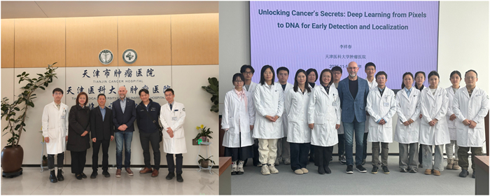 本次系列活动期间,外国专家还走进天津医科大学肿瘤医院,开展实地交流与合作探讨。其中,约翰・霍普金斯大学西德尼・金梅尔综合癌症中心的Won Jin Ho教授参观了医院临床试验中心、胰腺肿瘤中心,并与余俊教授、王秀超教授等胰腺科专家围绕临床诊疗难点、科研合作方向进行深入学术交流;ASCO副主席Christopher R. Merlan教授则与天津医科大学肿瘤医院肿瘤人工智能与大数据中心主任李祥春教授,就AI辅助肿瘤治疗的技术应用、数据安全等话题展开专项研讨,并在转化研究部王茜老师陪同下参观医院科技转化展厅,进一步了解天津在肿瘤科技成果转化领域的实践与探索,为后续深化国际合作奠定基础。天津市抗癌协会对外联络部部长徐婷婷陪同参观。